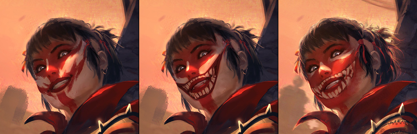 I was tasked with updating her face paint design for this set. You can see that it went through several changes during the process before ultimately going with the current one. The original is more like an abstract skull face. So this time, I went with a more graphic and literal grin to enhance her lunacy.